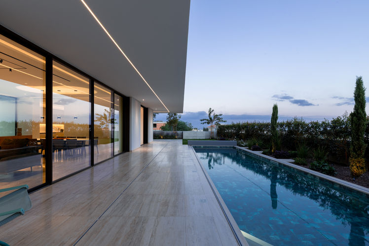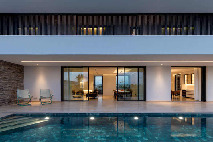The ground floor is conceived as an uninterrupted living field that expands toward the pool garden. Large sliding panels withdraw completely into wall pockets, dissolving boundaries and allowing the veranda to function as an extension of the interior. The pronounced overhang, nearly spanning the depth of the terrace, softens Mediterranean light while reinforcing the house’s horizontal composure.