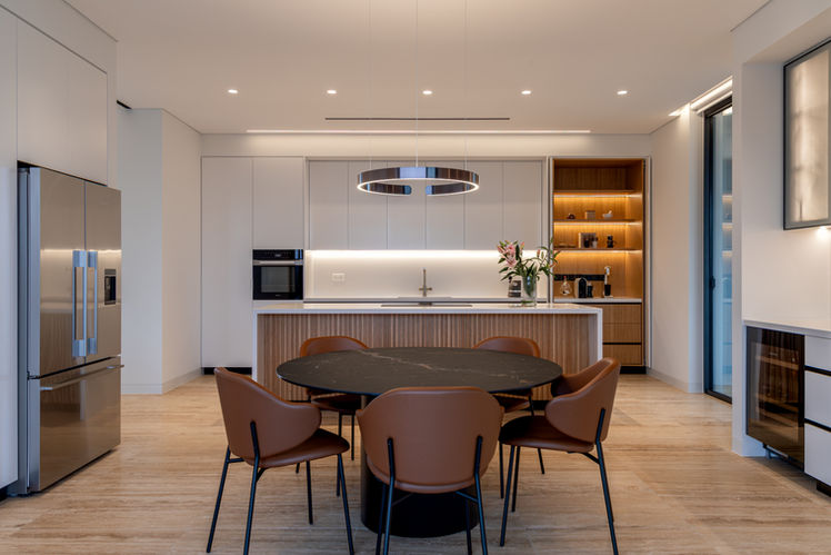 Custom carpentry, concealed infrastructure, and refined detailing create a purified backdrop against which daily life unfolds. Instead of overt spatial gestures, the architecture relies on proportion, material depth, and atmospheric nuance.